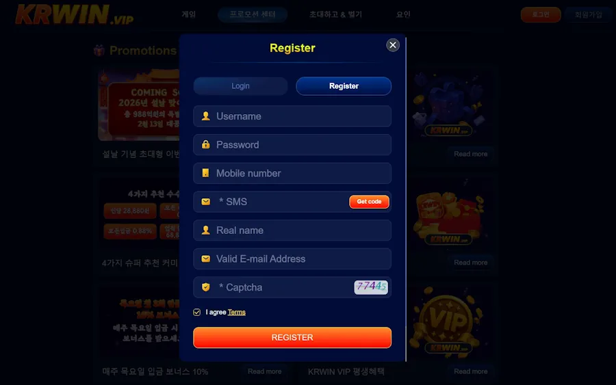 KRwin requires a valid South Korean mobile phone number for registration—no email-only accounts. Your password must contain at least 8 characters including 1 uppercase letter, 1 lowercase letter, and 1 number. Two-factor authentication is mandatory for every login, not just sensitive actions, and verification codes are sent to your registered mobile number.